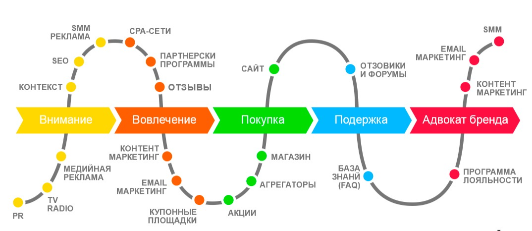 итоге — идеальное клиентское путешествие за ручку проводит клиента через шесть точек: точки контакта на этапе первичного осмысления → точки контакта на этапе оценки и выбора → точки контакта на этапе сделки → точки контакта на пользовательском опыте → лояльности → и триггерные точки.